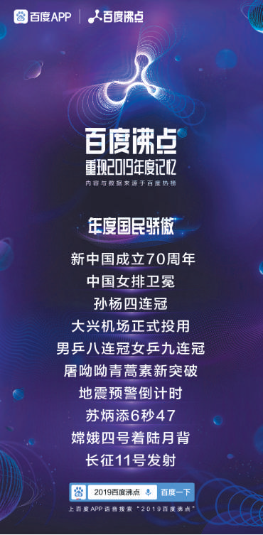 12月16日,一年一度的百度沸点年度榜单正式发布,今年百度开设包括年度关键词榜、年度国民骄傲榜、年度事件榜、年度流行语榜、年度热议榜、年度科技榜等13个榜单,多维度呈现网民2019年在各个领域中最关注的焦点议题。今年的百度沸点年度榜单中,“新中国成立70周年”冲入多个榜单前列,是年度最受关注的话题。此外,随着5G商用牌照下发和人工智能的全面普及,今年科技热词搜索热度依旧不减。作为国民获取知识和信息的最大平台,百度目前全平台累计用户数超过10亿,百度搜索占据72%的市场份额,百度信息流日分发量更是超过150亿,居全国首位。得益于这样庞大的搜索和信息流数据,百度沸点榜单才能真实、客观地记录并还原2019年中国社会的真实面貌。“新中国成立70周年”霸榜大事件、大人物共谱国民骄傲站在年终回望2019,它称得上是让我们足够骄傲的一年。嫦娥四号在年初成功着陆月球背面,是首次人类制造的探测器在月球背面实现软着陆;年中,长征十一号运载火箭在黄海海域成功实现首次海上发射;9月底,被誉为“新世界七大奇迹”的大兴机场正式投入运营,是全球最大的空港之一……但2019年最重要的事件莫过于新中国成立70周年,人们对于祖国的关注和热爱也客观地呈现在了百度沸点榜单中。关键词“新中国成立70周年”霸榜,成功跃居“年度关键词”、“年度国民骄傲”、“年度事件”、“年度热议”四大榜单榜首。与此同时,各行各业的杰出人物也在这一年频频突破创新,甚至实现了造福于世界的价值。世界杂交水稻之父袁隆平荣登“年度沸点人物榜”榜首,同样入选榜单的还有在青蒿素领域不断钻研并取得突破的屠呦呦。中国体育同样在这一年取得了令世界瞩目的成绩。郎平与中国女排一起再登世界之巅;孙杨达成了世界游泳锦标赛400米自由泳史无前例的四连冠;苏炳添6秒47夺冠,围棋国手柯洁一年揽得多个国内外冠军……“年度沸点人物”、“年度国民骄傲”等榜单纷纷记录下了他们这一年的荣光时刻。5G、AI带动全国科技热度升温国产文化集体走向繁荣随着5G和AI的全面落地,国民生活、各行各业正因科技的力量发生着巨大变化,这些新技术也一一体现在“年度科技”榜单上,可视作2019年中国科技发展的缩影。如今,人工智能技术在制造、医疗等行业中已经可以扮演相对重要的角色;5G更是这一年的科技热词,其速度快、低时延、稳定性强的特点不仅能进一步提升用户的网络体验,甚至还能满足未来万物互联的应用需求。AI寻人的上榜让我们看到了科技背后的温暖力量,智能家居、刷脸支付和VR、AR等更是让我们对于未来的科技生活充满了憧憬和遐想。2019也是国内文化产业全面爆发并走向繁荣的一年,尤其在电影行业,优秀的国产作品不断涌现。在百度沸点发布的“年度电影”榜单上,国产电影占据了八席,既有主题昂扬、气势恢宏的《我和我的祖国》,也有《流浪地球》这样的国产科幻巨作,《哪吒之魔童降世》、《少年的你》等电影同样取得了口碑与票房的双丰收。在大荧幕之外,还出现了如《亲爱的热爱的》、《陈情令》、《都挺好》等以质取胜的好剧;《乐队的夏天》则把人们对于综艺的审美重新拉回高基准,实现多方共赢。百度沸点2019中收录的这些科技、民生、社会、网络等不同领域的热词,无一不在呈现着中国社会的千姿百态。凭借搜索及信息流积累下来的海量数据,百度不仅为全社会提供了真实、客观的数据参照,成为了折射中国社会风貌的一面镜子;同时,由于其自身在内容和知识领域的布局以及不断被放大的媒体属性,如今的百度早已成为大部分人了解重大事件和答疑解惑的首选平台。